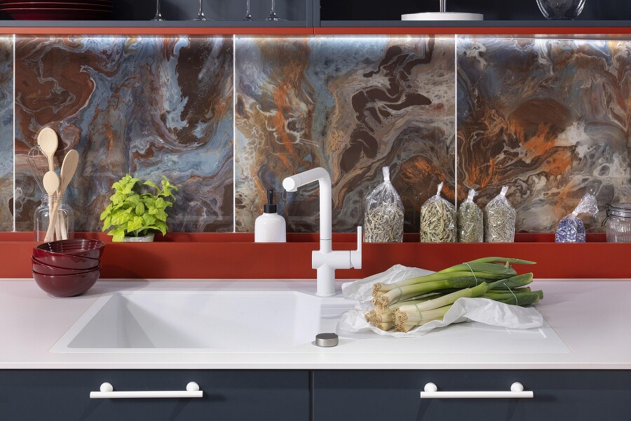 Doch Natursteinoptik ist nicht nur schön, sondern auch vielseitig. Die glatten Oberflächen lassen sich gut reinigen, sind hitze- und spritzwasserbeständig und somit ideal für den Einsatz im Koch- und Spülbereich. Von indirektem Licht bestrahlt – z.B. in Form versenkter LED-Lichtleisten oder -Spots im darüber hängenden Regalboard oder Oberschrank – kommen die organischen Muster noch stärker zur Geltung. Wie das Küchenbeispiel zeigt, lässt sich eine prägnante Farbe daraus toll für gleichfarbige Köcher o.ä. verwenden.