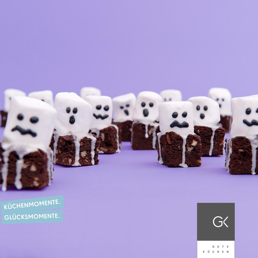 Wollen Sie Gäste, Familie, Kinder an Halloween mit gruslig-guten Gaumengenüssen „begeistern“? Dann könnten diese Brownie-Geister genau das Richtige sein. Sie gehen ganz leicht: 250 g zerlassene Butter nach und nach mit 4 großen Eiern, 400 g Zucker und etwas Vanilleextrakt verrühren. 150 g Kakaopulver, 1 Teelöffel Backpulver, etwas Salz dazu und gründlich aufschlagen. Nun noch 100 g Mehl und 250 g gehackte Nüsse unterrühren und in einer gefetteten Form bei 180 °C Ober-/Unterhitze rund 30 Minuten backen. Abgekühlt in kleine Quadrate schneiden, dann auf jeden Brownie-Happen einen Klecks Zuckerguss aus Puderzucker und Milch setzen, einen großen weißen Marshmallow draufkleben und diesen dann noch mal mit Zuckerguss übergießen. Die Augen und Münder lassen sich mit fertiger Schokoglasur oder schwarz eingefärbtem Zuckerguss anbringen. Fertig!
